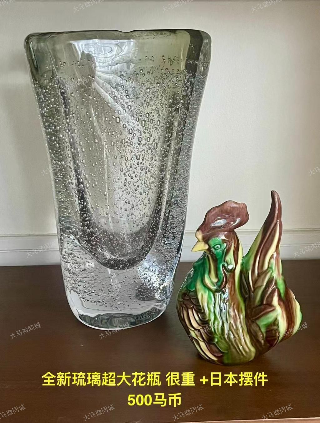 2. 全新琉璃超大花瓶(带气泡纹理,很重)+日本公鸡摆件:RM500